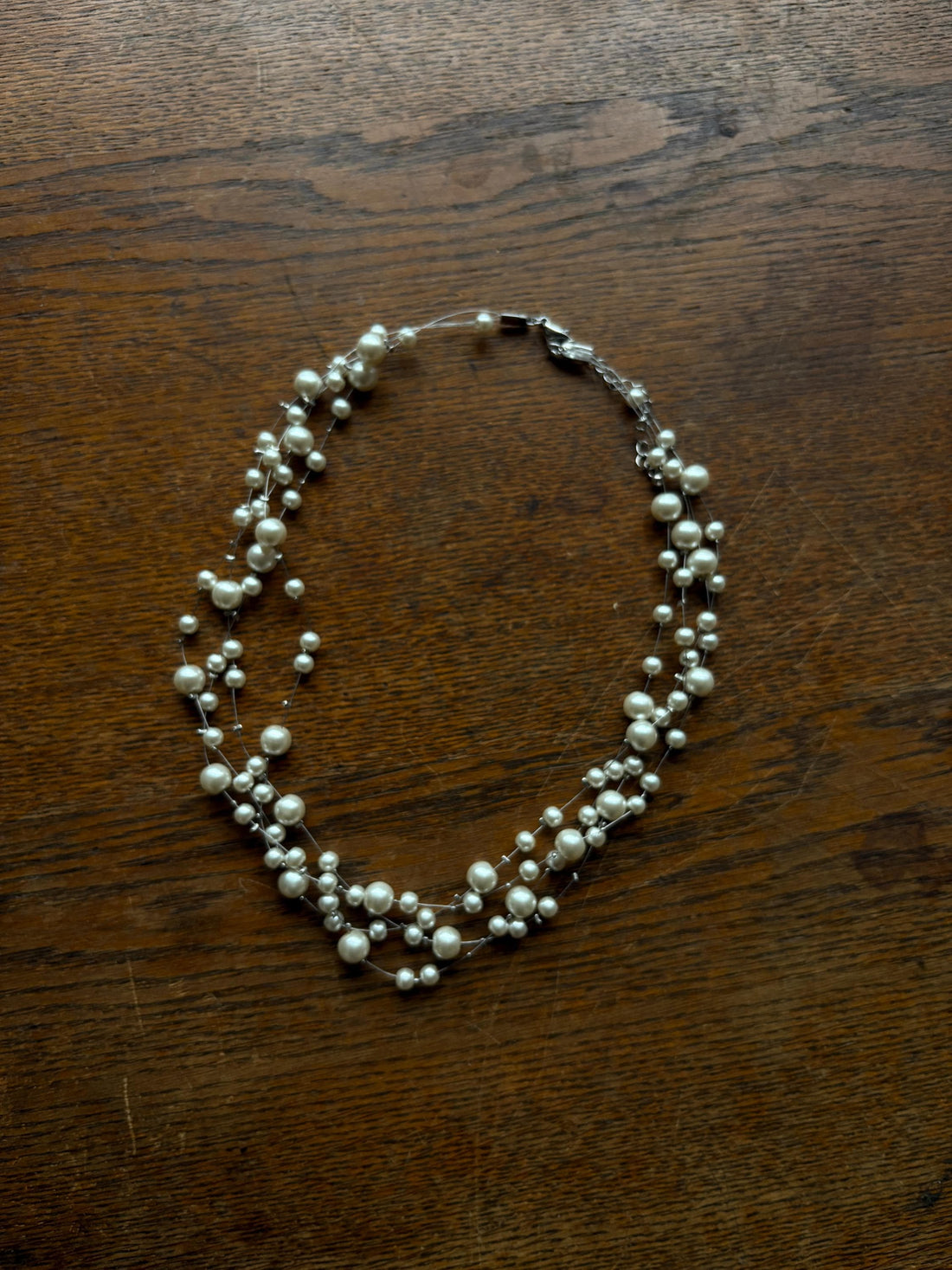 This elegant necklace features a luxurious cluster of white faux pearls, arranged on multiple strands of wire to create a sophisticated layered look. Finished with a metallic clasp, this accessory is versatile enough to enhance both formal and casual outfits. Perfectly suited for adding a touch of elegance to your festive season wardrobe, this necklace can effortlessly complement a black dress or any minimalist ensemble.